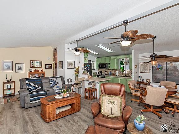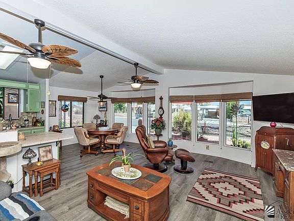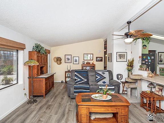 This charming 2 Bedroom, 2 Bath ground level Double Wide home truly reflects "Pride Of Ownership" inside and out. Bright open living & dining areas with wood laminated flooring throughout except for new vinyl floors in the bathrooms. Double Stainless sink in kitchen, Stainless Convection Microwave oven, Stainless stove and French Door refrigerator/freezer. Fans in every room including the laundry room, new granite countertop in the 2nd full bathroom, plus a walk-in shower in Master Bath. The best description for the exterior yards is "Enchanting" with custom brickwork, several shaded patio areas, with some of the wonderful yard art included with sale. Attached carport leading into a very spacious shop with benches, shelving plus this could be converted to a 1 car garage if desired. Plenty of outside storage with large shed plus another shed perfect for garden tools. Raised brick fences on 3 sides, a full length awning on the east side providing more shaded patio areas. This one needs to be seen in person!!