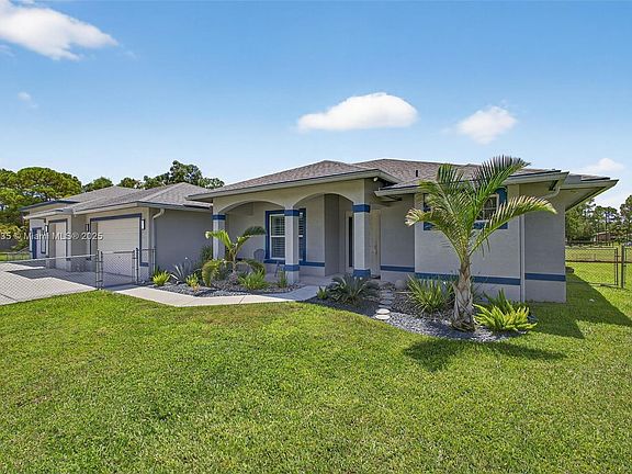 $7500 CLOSING CREDIT WITH AN ACCEPTED OFFER! Room to roam on this private 1-acre estate in The Acreage. Built in 2018 with CBS construction, this custom home offers 3 bedrooms plus an office, 3 full baths, and a sophisticated open-concept design. The gourmet kitchen boasts GE Profile appliances, walk-in pantry, and sleek finishes. Porcelain tile flows throughout, complemented by custom built-in closets and a whole-house water filtration system. Designed with energy efficiency in mind, this Synergy-built residence combines comfort and style. A remarkable 1,200 sq. ft. drive-thru garage with loft provides endless possibilities for recreational vehicles, storage, or a private retreat—perfect for those who want it all.