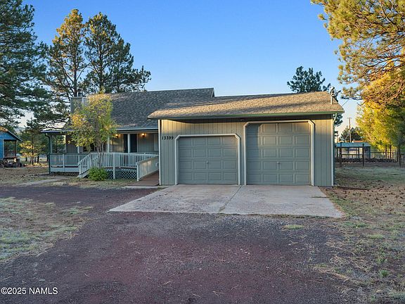 This charming stick-built home boasts a reliable water supply with a strong private well, eliminating the need for water hauling, and a large cistern to reduce on-demand usage. The inviting sunroom, or Arizona room, offers the feeling of being nestled among the trees. Spacious outdoor areas include large front and back decks for relaxation and entertainment. An oversized garage provides convenient access with a 10-foot door and an 8-foot door. On the main level, you'll find a bathroom, a bedroom, a washer and dryer, and a well-equipped kitchen. The upper level features two generously sized bedrooms with storage and breathtaking views of the San Francisco Peaks. Well-maintained county roads ensure year-round accessibility. Additional amenities include a greenhouse, smoker, and proximity to the national forest, enhancing outdoor living. Modern efficiency is achieved with newer appliances and a fantastic wood stove, offering a cozy alternative to the furnace during winter and helping to reduce heating costs. The stunning interior features beautiful wood tongue and groove accents, making this cabin-style home the perfect charming getaway or the home sweet home you've been dreaming of.