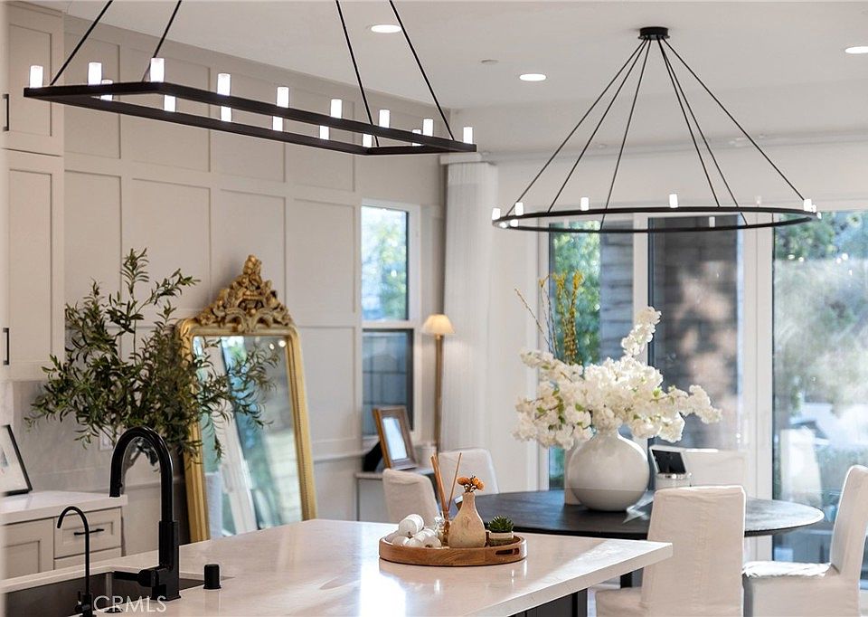 The kitchen flows seamlessly into the dining and living spaces, highlighted by designer lighting and soft natural tones. When the sliding doors open,the indoor and outdoor spaces merge effortlessly, revealing a tranquil central side courtyard that connects every corner of the home with nature — perfect for al fresco dining or quiet evenings under the California sky.