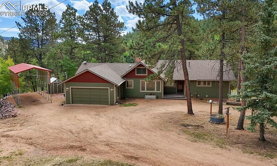 This one-of-a-kind gem will not last long! Welcome home to this peaceful 5-acre secluded lot located at the end of a culdesac with mature trees, a private meadow and plenty of room to watch the animals roam. The property is immaculate, complete with a two-horse loafing shed, 3 additional storage sheds, two RV carports, a large fire pit area, two decks, and one with a hot tub to enjoy the stary nights. This charming rancher has main-level living at its finest. A roomy entry with hardwood floors leads to a sunroom, soaking in the morning sunlight, complete with a walk-out deck. The kitchen features hardwood floors, cabinets, granite countertops, and a stone backsplash. The living room is very cozy, with a pellet stove and large windows overlooking the views. The main level also boasts two primary suites. One with a private deck and hot tub. The other has a large bath complete with a soaking tub. There is also a secret kids loft space play area above the kitchen! The lower level can be used as extra living space or a possible 3rd bedroom. This house has hardy plank siding, triple pane windows, stamped concrete porch, and Trex decking. If you are looking for a tranquil place to call home only 5 minutes from Woodland Park and all the convinces of town, this is the perfect blend of both! Come take a look, you might just fall in love!