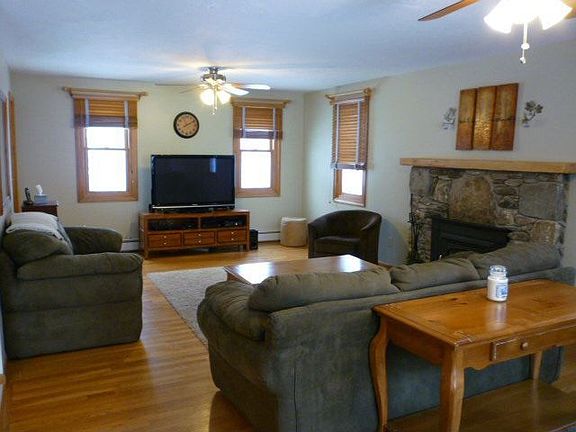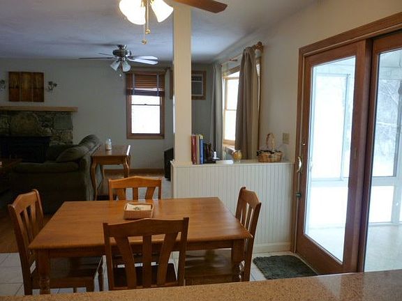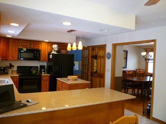 Set back from the road, a three level, four bedroom colonial occupying a 2.03 acre lot on Fitch Pond. New three season sunroom off the back with a small grilling deck above a beautiful new patio. Newly renovated kitchen, open concept, with eating area leading to a large front-to-back living room. A separate formal dining room and a half bath with laundry (off a mudroom with large pantry) complete the first level. Hardwood flooring on the first floor, carpeting on the second and third levels, and also in the large, open, newly finished basement. Second floor has sitting room/office, a large bedroom and full bath, and the master bedroom. Another full bath with large tub and separate shower in the master, and a large walk-in closet, leading to another closet room spanning the entire length of the two car garage below, carpeted and outfitted with shelves, drawers, and counters from California Closets. Third floor boasts two additional large bedrooms and a half bath, as well as attic space and a whole-house fan.