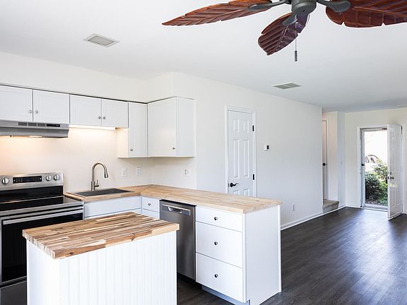 This end-unit Carrboro townhome is beautifully updated! In the kitchen, you'll find newer white cabinets & stainless steel appliances, a laminate/butcher block style counter, plus an island for additional workspace & storage. Low maintenance LVP flooring on main floor & wide open floorplan with no dividing wall between dining area & living room--entertain with ease! Two carpeted bedrooms up. ALL BATHS UPDATED. Smooth ceilings & fresh paint. Washer & dryer. End-unit privacy with yard off patio in rear. Bus-stop just up the road makes your commute to work & school a breeze. Hike on nearby greenway trails. Convenient location mins from UNC & downtown Carrboro *** Please check out https://canterburycarrboro.com/ for important HOA info.