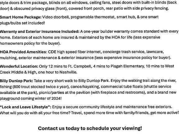 Conveniently located just 12 minutes to Fort Campbell, 4 minutes to Pisgah Elementary, 10 minutes to West Creek Middle and High School, and approximately one hour to Nashville. A brand-new Kroger Marketplace is just one mile away, and the new TriStar Health hospital is currently under construction approximately five minutes up Tinytown Road. Pin of GPS to the property: https://maps.app.goo.gl/bJUVcFuPxFMFrdZ76