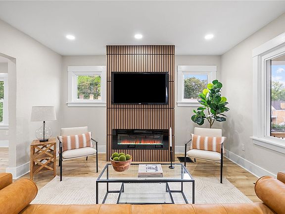 New electric fireplaceQuartz countertopsModern finishesNew linen-colored sidingNew furnaceCovered front porchDesigner tile