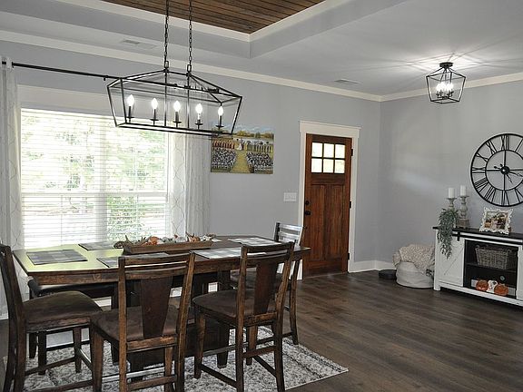 - Open concept kitchen, dining and living room with tray ceiling in dining area