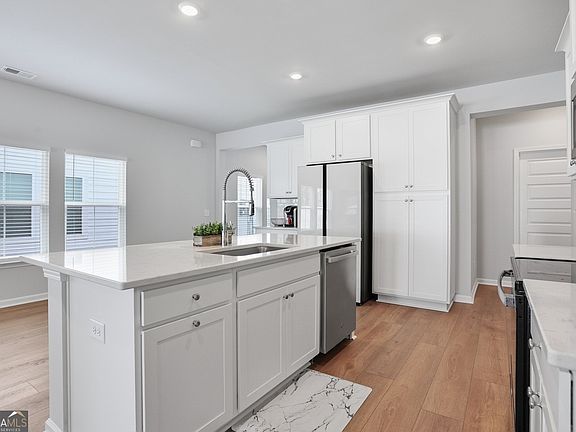 Open floor planHuge quartz islandZero entry tile showerLuxury vinyl plank floorsDesigner kitchen