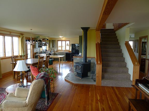 Custom built high efficient home on over 5 acres with distant mountain views, hardwood floors, main floor utilities, excellent storage, open kitchen dining, lots of windows, skylights, extensively landscaped with large combination garage/shop, fenced yard and great garden spot.
