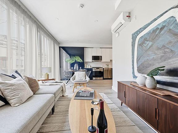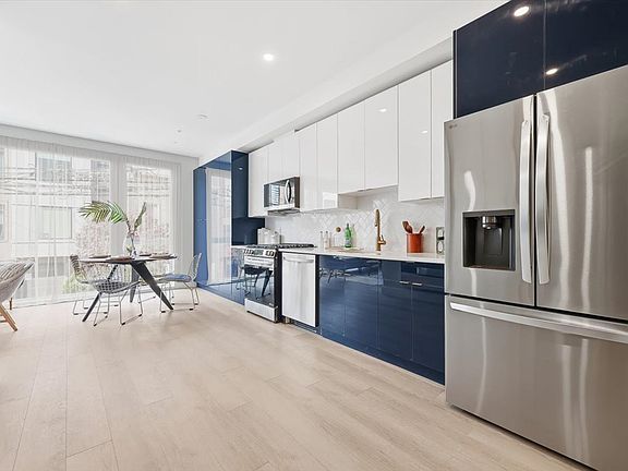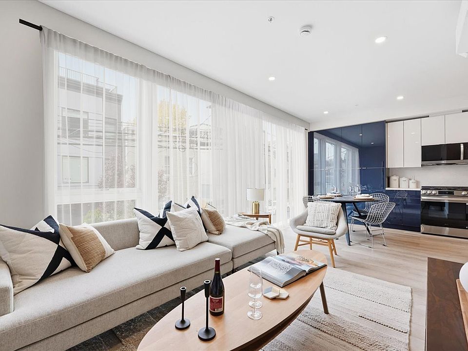 Wide plank floors ground the space, while natural light floods through the floor-to-ceiling windows illuminating the open floorplan. The kitchen offers clean lines and contemporary flair with modern white & blue cabinetry, gleaming quartz countertops, herringbone tile backsplash, sleek brass-accented fixtures and stainless steel appliances.