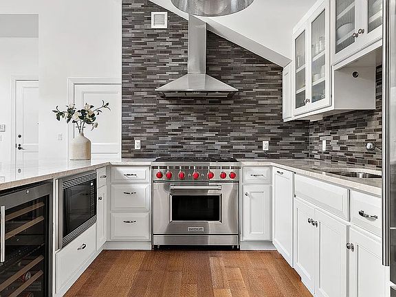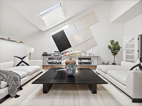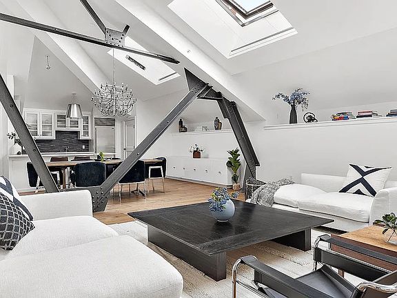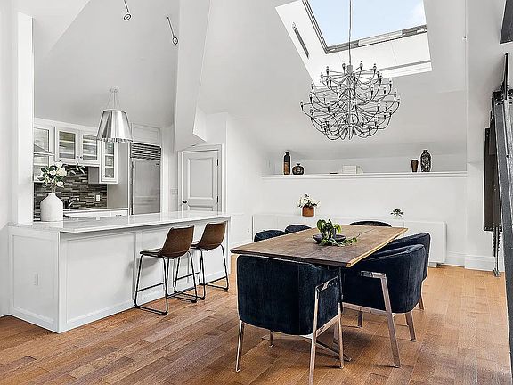 Spanning over 2,900 square feet, this exquisite residence welcomes you with loft-like proportions and a desirable separation between public and private spaces. The upper level begs to entertain with an open-plan layout surrounded by wide-plank white oak floors, designer lighting and soaring 17-foot-tall ceilings punctuated by three large skylights and dramatic beam details. The state-of-the-art open kitchen embraces both form and function with custom cabinetry and quartzite countertops surrounding premium stainless steel appliances, including a vented Wolf gas range and microwave, Sub-Zero refrigerator, Bosch dishwasher and Liebherr wine refrigerator. A long breakfast counter provides the perfect setting for casual dining and conversation. A skylit den/bedroom, full bathroom and coat closet complete the upper floor.