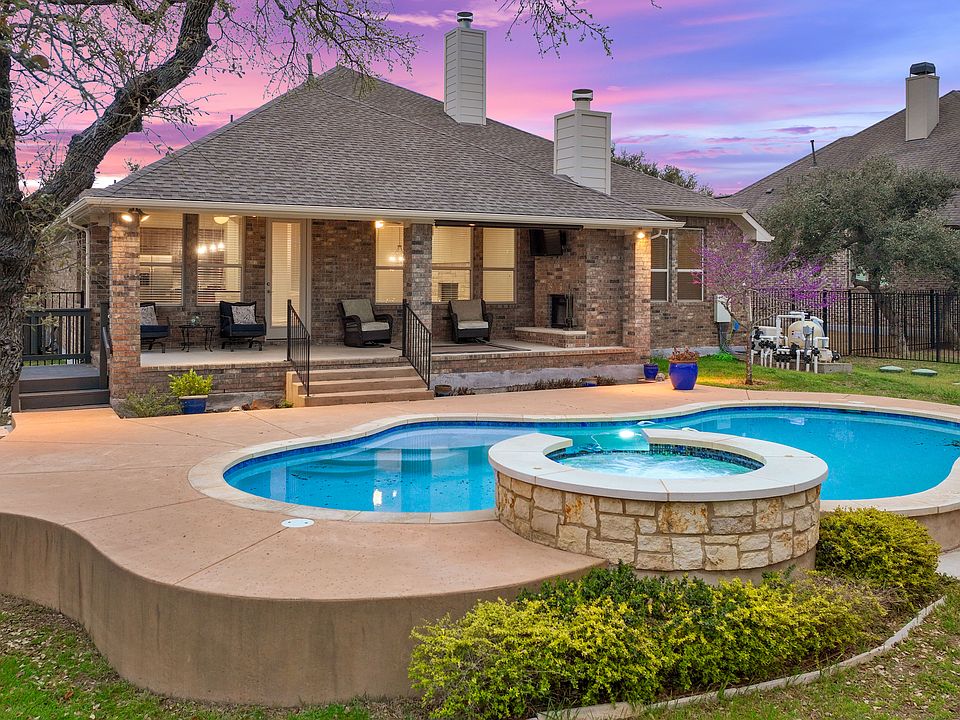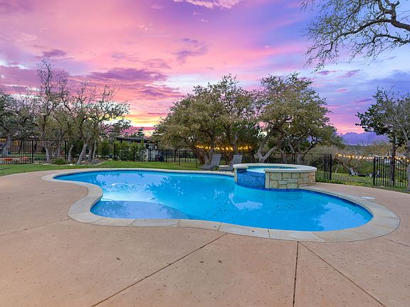 Experience unparalleled serenity and breathtaking views from the privacy of your patio and pool in this exquisite single-story home, nestled on nearly 1 acre in the heart of Dripping Springs' scenic Texas Hill Country beauty. Boasting 4 spacious bedrooms and 2.5 luxurious baths, this gorgeous residence epitomizes the perfect blend of elegance and comfort. The property's exceptionally unique, panoramic vistas provide a stunning backdrop to the meticulously manicured lawns, both front and back, complete with a cozy fire pit for enchanting evenings under the easily visible stars due to Dripping Spring being the first city in Texas to be designated as an international dark sky community. The highlight, a fabulous pool and hot tub adorned with a cascading waterfall, invites endless moments of relaxation and leisure. Beyond the graceful iron fencing, the lot extends to offer direct access to 19 miles of hike and bike trails, presenting an exclusive gateway to explore the natural beauty of the region. Inside, the home unfolds into an open floor plan that seamlessly connects the large family room with the gourmet kitchen, creating an inviting space for gatherings and culinary delights. Adorned with waterproof luxury vinyl plank flooring throughout, the interior is freshly painted and features updated lighting, setting a modern and sophisticated tone. The exterior also is freshly painted and the practicality of a 3-car tandem garage, with a convenient side entry door, complements the home's thoughtful design. Situated within one of Dripping Spring's highly sought-after neighborhoods and acclaimed, A-rated Dripping Springs School District, this property also enjoys proximity to a variety of area restaurants and entertainment options, all within walking distance. Offering an unparalleled lifestyle where luxury meets the great outdoors, this home is a sanctuary of peace and beauty, awaiting those who appreciate the finer things in life.