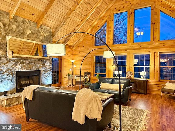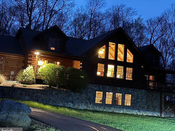 Sellers accepted offer sight unseen. Would look at back up offers. This five bedroom, three-and-a-half bath estate located in Berkeley Springs is perched atop a mountain on ten wooded acres acres near Cacapon State Park. Private and secluded, this 4000-square-foot custom-built home with a 32X28 double car garage has expansive mountain views—plenty of land to explore—and room to grow. Possibilities abound on the land for a garden, a vineyard or even stables. The home has been lovingly maintained and updated by the current owners (only the second family to live there) both inside and out. The entire exterior of the home was stained after extensive repairs were made to the log exterior. In April of 2024, a new GAF roof was installed with a 50-year transferable warranty (see attached docs for warranty details). Gutter guards were installed; the driveway was updated and recoated; the concrete patio was reinforced and upgraded. The entrance to the home is welcoming and once inside, the massive stone, wood-burning fireplace at the center of the home is in your line of sight, eclipsed only by the wall of windows overlooking the mountains. Luxury vinyl plank flooring covers the main level (practical for this type of living) with the exception of the newly added hardwoods in the primary suite. The open floor plan allows for easy entertaining from the gourmet kitchen (stainless steel appliances, an induction cooktop, hickory cabinets, quartz countertops) Not only is there tons of cabinet space and an additional smaller pantry, but there is a massive, butler's pantry plus laundry room with even more room to store, prep and execute events in the dining and living space or out on the patio off of the dining room with a natural stone fire pit. The hallway off the kitchen provides access to the butler's pantry, basement and garage, as well as the half bath and the office with custom built-in bookcases. The primary suite is on the main level with an en suite bathroom; a massive walk-in closet with a built-in Sentinel gun safe; and french doors creating a private entrance to the mountain view deck. The primary bathroom is a suite unto itself! It has two vanities with granite countertops and ample storage; faucets in oil-rubbed bronze; a stall shower; and a huge jetted tub surrounded by windows, light and views of nature. The upper level mezzanine overlooks the living room and sits opposite the wall of windows and has its own seating area located centrally between the four bedrooms and two bathrooms upstairs. Two of the bedrooms have massive walk-in closets with wall safes permanently installed. Tucked away out of site in the lower level is a bonus room—the ultimate man cave—a 230-square-foot finished space that works perfectly as a media room, bar room or cigar lounge. Plenty of room to add a wine cellar, root cellar or storage for emergency provisions. If you love to have the possibility of customizing raw space, perhaps building out an in-law or caretaker suite or even a rental apartment, the lower level provides 2000 ft of raw space with full daylight and a separate walk-out entrance with rooms already framed as well as rough in plumbing to continue your vision. This house is strong and efficient with the systems primarily in the lower level—including the heat pump, wood furnace, 50 gallon water and the newly-installed (2025) water softener and treatment system including reverse osmosis drinking system. There's back-up power via a generator transfer switch in the garage (you supply the generator)