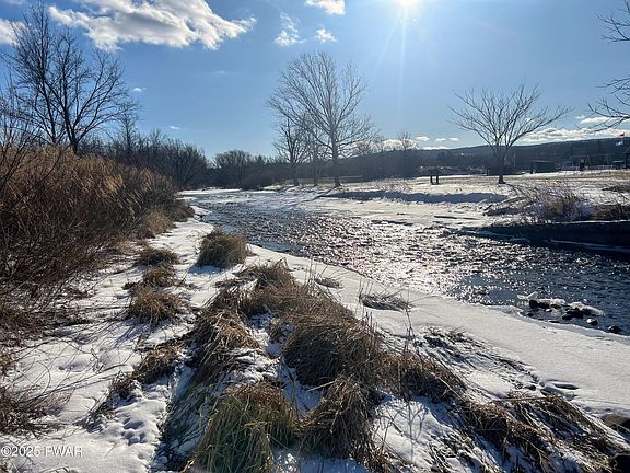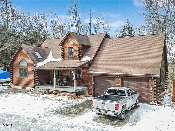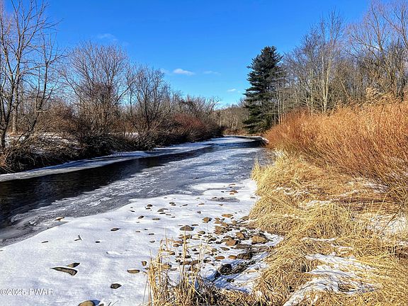 BEAUTIFUL custom-built log home, situated on nearly 10 acres of woods, trails, ponds and approximately 500 feet of frontage on the Wallenpaupack Creek! Whether you are an outdoor enthusiast or seeking a peaceful retreat, this property offers the perfect blend of seclusion and accessibility. Home features an open floor plan, lots of natural light, and a beautiful skybridge staircase overlooking the living room and eating area. Stone faced fireplace with a wood burning stove creates a warm and inviting atmosphere and the updated kitchen and formal dining room is a perfect place to entertain. Two spacious bedrooms with walk in closets and full bathroom can be found on the second floor but if more room is needed, there is a full finished walk out basement featuring a bathroom and a separate bonus room, ideal for a home office or gaming area! Two car attached garage and plenty of storage space inside and out! Within walking distance to local restaurants and Carlton-Drake Memorial Park and just a short drive to Lake Wallenpaupack, Skytop Lodge, Promised Land State Park, I-84 and other major Pocono attractions!