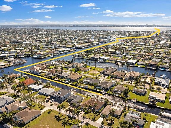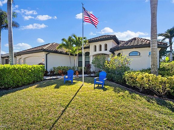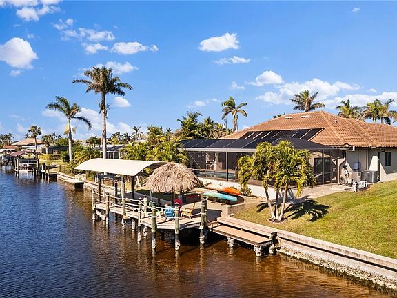 Beautiful home with direct gulf access and desirable southern rear exposure on Santa Maria Canal. Without any bridges and only minutes to the open water, easy access to the Caloosahatchee River and the beaches, this property is a boater's dream. Located on a quiet cul-de-sac in a great neighborhood, this home offers 4 bedrooms plus a den, 3 bathrooms and a 3 car garage, 12-foot coffered ceilings in the great room and den as well as coffered ceilings in the master and junior suite. The kitchen features built-in appliances and a large kitchen island with granite counter. The master bath provides two separate sinks, a walk-through shower and a built-in tub. This home is tastefully furnished and decorated and comes turnkey with only a very few exceptions. Outside you find a large pool deck with panoramic picture screen, outdoor shower, salt water and solar heated pool with sun-shelf and spa, summer kitchen with built in grill, sink and fridge and a lanai with electric roll down shutters. The boat dock includes a 10k lbs. boat lift with canopy, a kayak launch and Tiki. This property was not flooded and is perfect as a permanent residence, a second home or a successful vacation rental.