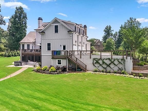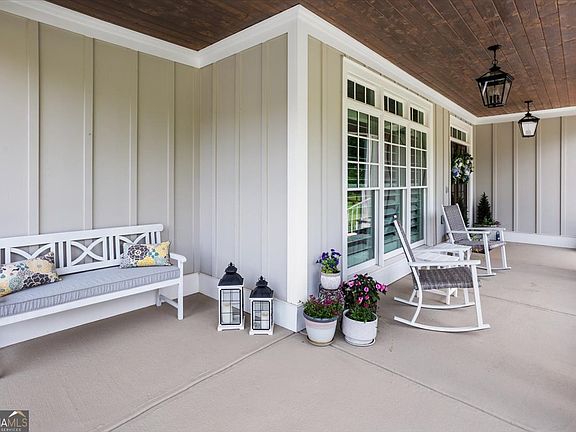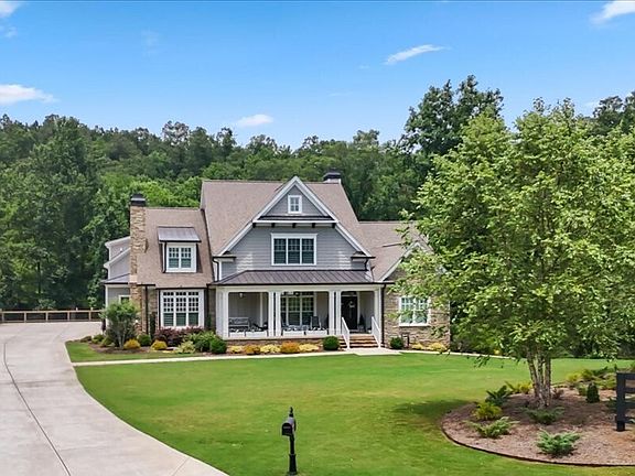 Experience the rare opportunity to own an extraordinary luxury estate, a tranquil masterpiece nestled on two private, park-like acres with stunning frontage on the serene Sharp Mountain Creek. This one-of-a-kind residence is the perfect fusion of natural beauty and refined living, offering an unforgettable setting where the soothing sound of flowing water and complete backyard privacy define the everyday. Tucked away in an exclusive cul-de-sac, this meticulously designed Craftsman-style home presents a sprawling floor plan with 5 spacious bedrooms, 5 full bathrooms, and 2 half baths, reflecting a commitment to luxury finishes throughout. Step inside to discover timeless elegance and elevated design. The main level features hardwood floors, an open concept layout, and detailed millwork. Walls of windows frame peaceful landscape views. The heart of the home is a chef's kitchen with custom cabinetry, upgraded GE Monogram appliances, quartz countertops, a large island, farmhouse sink, and a stunning wood-trimmed range hood. This space flows effortlessly into a vaulted keeping room with a stone fireplace, and a grand family room with a coffered ceiling and a second stone fireplace offers additional luxury living space. The main-level primary suite is a private sanctuary featuring a sitting room and a massive walk-in closet, complete with a spa-like ensuite offering quartz dual vanities, a soaking tub, and an elegant custom-tiled shower. The upper level hosts three thoughtfully designed bedrooms, each with its own ensuite bath, ensuring comfort and privacy. A separate staircase leads to an expansive bonus room, ideal for a home office or playroom. The fully finished terrace level provides a seamless extension of the home's living and entertaining space. It includes a second fully-equipped kitchen, an inviting media room, private guest quarters, a fitness room, and a beautifully appointed family room, perfect for sophisticated entertaining. The backyard is a masterpiece-a tranquil creekside retreat. Enjoy summer evenings gathered around the firepit, soaking in the hot tub, or relaxing on the screened porch-all while overlooking the creek and beautifully manicured grounds. Premium features include a whole-house generator with surge protection, tankless water heater, irrigation system, and a spacious 3-car garage. Located in a top-rated school district with convenient access to the interstate and minutes from the charming downtown Ball Ground. This is more than a home-it's a sanctuary where elegance, serenity, and modern luxury unite in perfect harmony. Schedule your private showing today to experience this unparalleled creekside lifestyle!