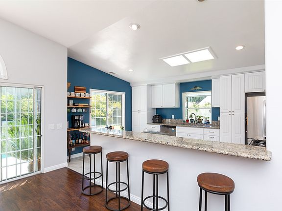Private charming home perfect for entertaining or just relaxing by the pool. The flowing floor plan and large windows and sliders boasts natural light throughout the home. Gourmet kitchen with beautiful quartz counter tops and stainless steel appliances. The master suite has its own fireplace and gorgeous master bath.You'll feel like you're at a retreat with the waterfall cascading into the pool, hot tub, custom made bar with glass fire pit in the middle, outside bathroom, and a large grass side yard.