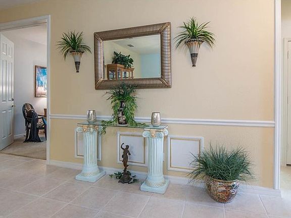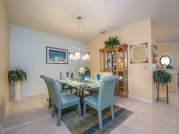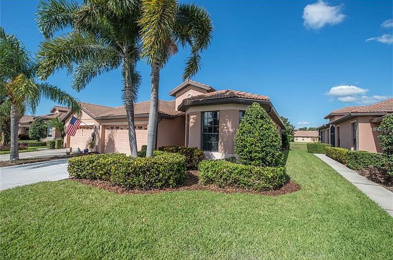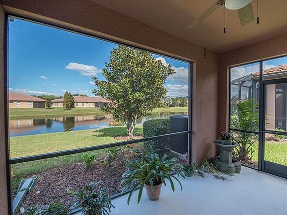 The largest paired villa, The Beachcomber (formerly, The Rhodes) features everything you'll want in this 55+ community! A HUGE great room features beautiful, engineered hardwood floors and crown molding. Prep for a dinner party in the lovely kitchen with 42" corian counter tops and new stainless steel appliances. Then entertain in style in the large formal dining area. Get creative with the quaint den, just perfect for an office, library or a hobby room! Nothing but pure serenity from your screened lanai that overlooks a beautiful pond full of wildlife! Enjoy peace and quiet in your master suite with a private bathroom and a spacious walk-in closet. The bay window adds a touch of character to the generously sized second bedroom. Added perks include new hot water heater and AC unit in 2012 and many added features to make this villa even better! Florida life doesn't get sweeter than Del Webb's SouthShore Falls! Amenities include two gorgeous pools, hot tub, resistance pool and a state-of-the-art gym! You can play tennis, pickleball, Bocce ball or practice on the putting green! Don't forget to enjoy the 14,000 square feet of clubhouse bliss with Billiards, an Internet cafe, craft/hobby room, library, ball room and so much more! There are clubs, and events just waiting for you to sign up! This maintenance free, gated community is highly sought after so act fast.