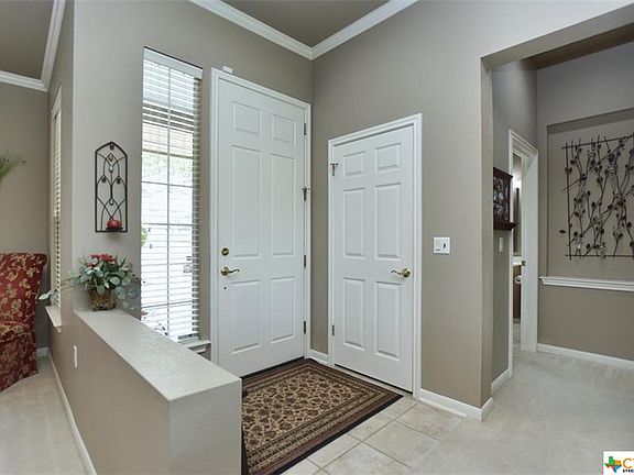 Hugging a natural greenbelt, complete with miles of walking trails, this pristine Sun City Texas Brazos welcomes you with pretty landscaping & freshly-painted exterior. The delightful welcome continues inside with sparkling windows across the back of each room that adds wonderful natural lighting & endless views of the park-like setting. Freshly painted interior, crown molding, 9' ceilings, updated fixtures, stainless appliances, french doors, Lg laundry/craft rm, XL side entry garage, private back yard.