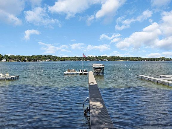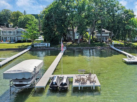 This classic contemporary lake home is gracefully situated on a lovely level wooded lot that gently slopes to the pristine clear water with 60'ft of sandy swimmable frontage. This is where treasured memories are made. The entire main living area was designed to immerse you in lake views from every room. The main level with wood floors includes: a spacious kitchen and dining area open to the great room with cathedral ceiling, floor to ceiling fireplace, wet bar and half bath. The bedrooms are on the second floor with an additional guest bedroom on the lower level that also includes a full bath, family room and natural fireplace. The 3rd floor windowed cupola is perfect for reading a book during a snowfall or a thunderstorm.