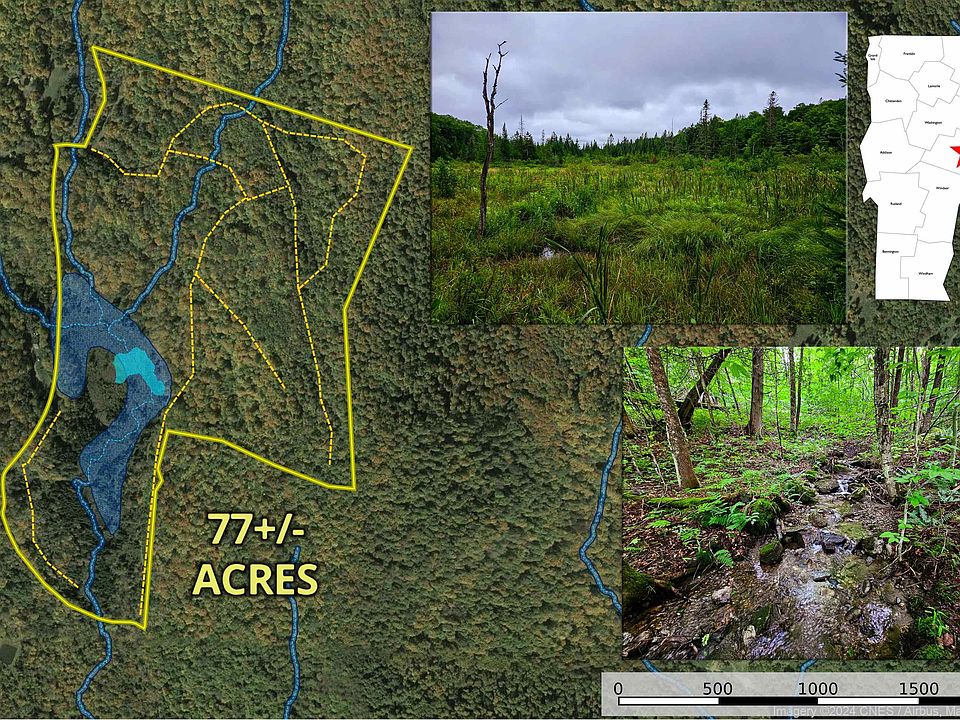 The search is over for the tranquility you desire! Enjoy the diversity of 77+/- acres of mostly northern hardwoods, a small, beautiful wetland with several little ponds, well-established trail network, several streams, and wildlife big and small! This property has been thoughtfully conserved via the Upper Valley Land Trust to preserve its natural beauty and natural resources. You may build two separate cabins for seasonal use, post the property, build hunting blinds, create trails, ride your ATV and snowmobiles, and harvest the timber, basically all standard recreational uses. Located on a well-cared-for private dead-end road, this property has great access despite being off the beaten path. There is no power or utilities available, so enjoy the serenity without distraction. Hikers, nature enthusiasts, cross country skiers, and hunters will love the gentle to moderate topography, the many signs of wildlife, including deer and moose and the trails accessing virtually all areas of the parcel. Hunting blinds and tree stands are permitted and light infrastructure for the cabins – like composting toilet, woodstove, small propane supply and water collection may be permissible. Cabins can be up to 600 sq ft each, so plenty of space for a basecamp. Entire property is enrolled in the Current Use program, so taxes are low. There’s a small clearing near the entrance to the property, great for tenting or camping. Comfortable proximity to both I-89 and I-91.