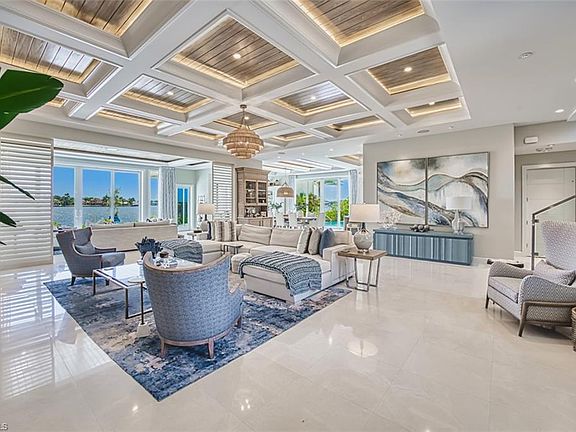 Offering spectacular waterfront living at it's finest is this crowning jewel of Jewel Box Avenue. Residing at the point of Chesapeake canal and Naples Bay stands this 4 bedroom en-suite estate with panoramic west facing water views from nearly every room. Owners will enjoy the first floor primary en-suite with 2 large walk in closets, huge primary bath with separate shower and soaking tub. Steps from the primary bed is a cozy outdoor sitting area with electric (remote controlled) retractable screens and shutters to enjoy the amazing sunsets over the bay. Guest will enjoy the second floor privacy with elevator access. Each en-suite has its own wrap around balcony access with spacious lounge areas and west facing water views. Additionally the second floor offers multiple en-suite wet bars, sitting area and media room that could easily be used as a 5th bedroom. Perhaps the star of the show is the nearly 8000 sq-ft of outdoor living space with waterfront infinity edge pool, 2 spas, outdoor kitchen, pool bath and multiple docks and boat lifts. Boaters will appreciate this section of Naples Bay is a no wake zone and the home resides well away from the channel marked area thus offering peace and quiet calm waters. Additionally the boat lifts have been strategically installed on the north canal side of the property offering further protection. The area has recently undergone extensive dredging and this property can dock larger vessels with a 24,000 lbs boat lift and 13,000 lbs jet ski/kayak platform lift. The list of upgrades to this home are extensive with a recent 7 figure renovation and refurnishing which WAS NOT a result of flooding or any storm damage. If you are looking for a well built turnkey waterfront property that lives like a high end resort 1340 Jewel Box should be considered.
