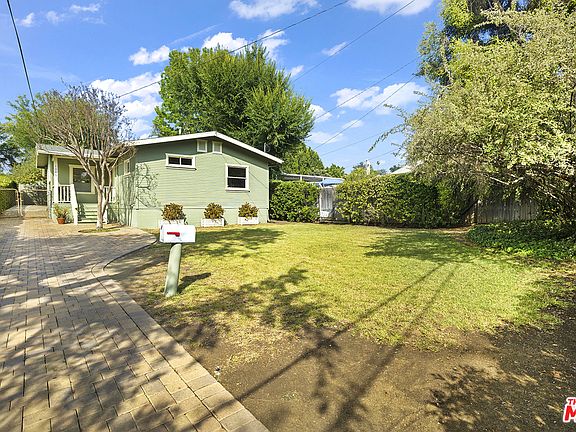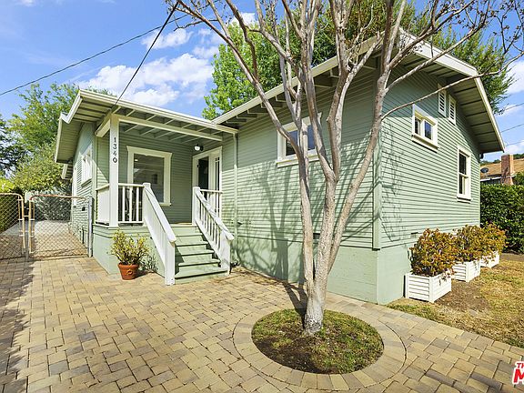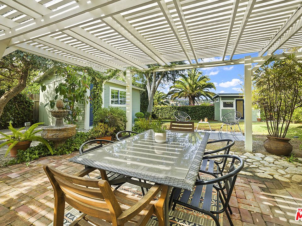 Situated on a quiet and private street in the hills of Eagle Rock, this California bungalow includes two detached bonus spaces. Originally built in 1926, the home is lined with gleaming hardwood floors and colorful custom tile. The generous primary suite comes equipped with a palatial bath, and the kitchen's built-in breakfast nook is filled with natural light. French doors open from the dining room out to a brick patio framed by a cozy pergola, showcasing breathtaking views of palm trees, mountains, and the city below. The converted garage functions as a high-ceilinged studio space, and an additional freestanding studio is perfect for a home office or creative space. Both studios match the main home's aesthetic, bringing a calming consistency to this special property. The large lot offers ample flat, grassy space in both the front and back yards. 1340 N Ave 46 is perched right above York Blvd and Occidental College, giving you easy access to the best of Eagle Rock and Highland Park.
