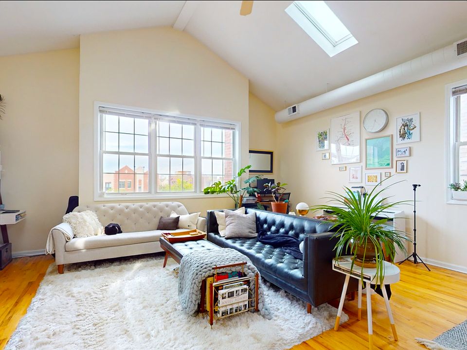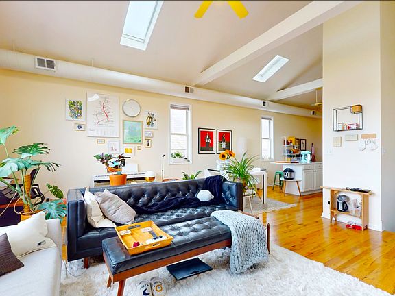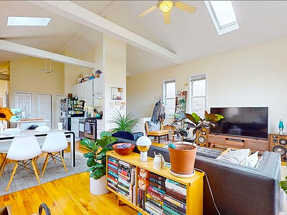 The unit is a light-filled 3rd-floor walk-up with skylights and 14-foot cathedral ceilings. It has central air, central heat, stainless appliances including dishwasher, and in-unit washer-dryer. A big kitchen island makes cooking fun and easy, and we have a little deck out back to sit in summer. This is a quiet 3-unit building, and our downstairs neighbors are sweet and considerate.