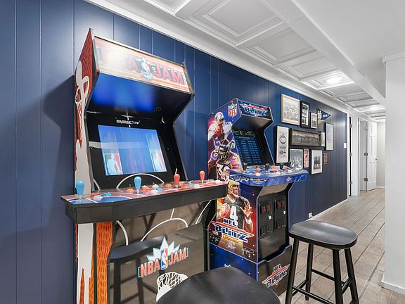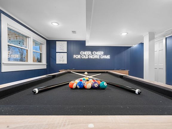 -Notre Dame sports themed game room equipped with a pool table, shuffle board, arcade games, and smart TV.