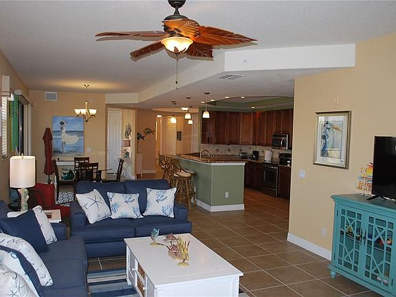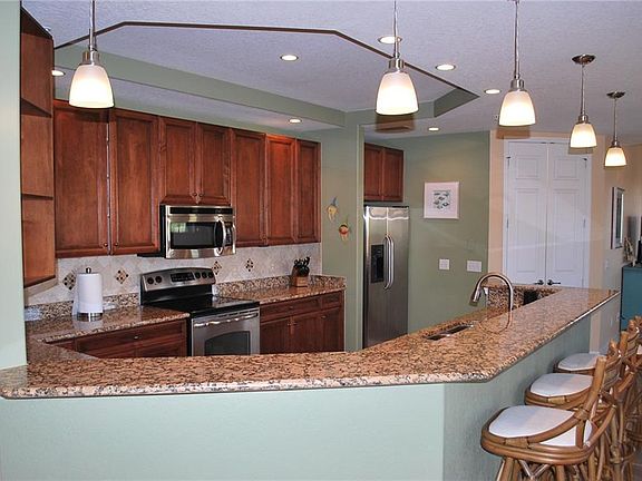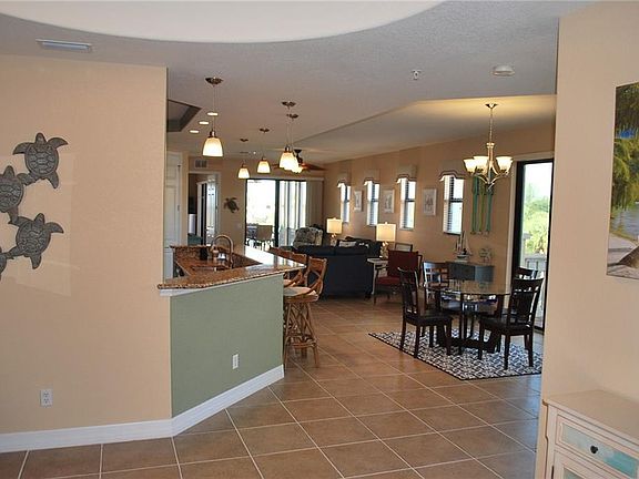 An exquisite 3 bedroom and 2 bath condo that encompasses so many unique features. Highly desired end unit that boasts many windows and sliding glass doors to bring in the natural lighting of the Florida sunshine. Sit out on the screened-in lanai outside the master bedroom and enjoy the morning sunrise and the beautiful water view. Located on SAILBOAT ACCESS water canal (no bridges to the Gulf) which hosts your deeded boat dock. Inside you will find an open concept that is tastefully decorated and appointed with ceramic tile, high ceilings, blinds and window treatments, tray ceilings with ceiling fans, decorator and recessed lighting lights up the kitchen and the beautiful granite countertops, plus the breakfast bar easily seats 4. Kitchen has great lighting, custom wood cabinets for plenty of storage, stainless steel appliances, custom tile backsplash and a large closet pantry. The 2nd bedroom hosts a Murphy bed but is currently being used as an office and the 3rd bedroom has sliding glass doors that open up to a fantastic tropical view and the front water fountain. Coming into the condo guests will be welcomed with Florida decor as well as a full open floor plan and includes a circular tray ceiling. Master suite is huge and includes a walk in closet and 2 linen closets coupled to the master bath with his/her sinks and a spacious shower. The one of a kind large 36X23 private terrace (pavered) makes entertaining a breeze coupled with a beautiful view overlooking the pool and the salt water canal.