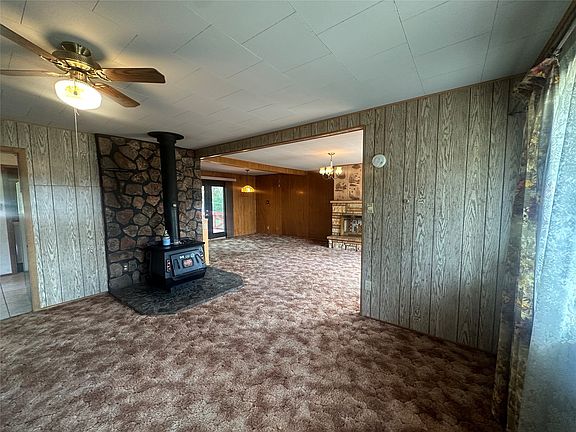 There is beautiful rock work around the fireplace (which has not been used for a while!). There is also a wood stove in the living room area! The home has Beautiful Maintenance free rock work on all sides except for the East side (of the garage!). Enjoy working and parking in the heated 2 car garage!