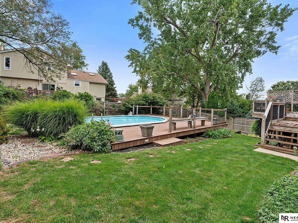 UPDATES!! Spacious 4-bed, 3-bath two-story home with a walkout basement & swimming pool. A charming covered front porch warmly greets you, inviting you to sit outside. Inside, enjoy a flowing layout featuring a formal living and dining room, plus a separate family room w/ cozy gas fireplace that opens seamlessly to the kitchen & informal dining areas. The kitchen offers abundant cabinetry & counter space, a pantry, NEW SS appliances, and a double convection oven. Step outside through the sliding glass door to a massive composite deck overlooking an above-ground pool! Upstairs, the laundry is conveniently located near all bedrooms. Primary suite features a walk-in closet, dual vanities, whirlpool tub, and separate shower. UPDATES: tankless water heater (2023), newer furnace/AC (2019), maintenance-free vinyl siding (2020), windows, sprinkler system, & professional landscaping. Walkable to Blackhawk Park, Daniel Trail & Stonecroft Park. Near Offutt AFB & Tregaron Golf Course & shopping.