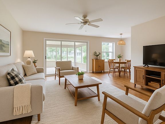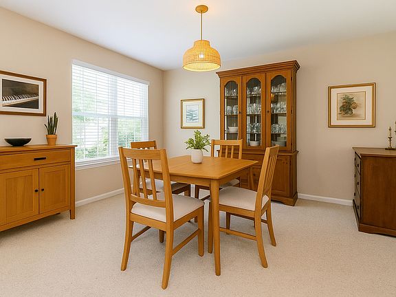 Welcome to this beautifully maintained Cartier model ranch in the popular 55-plus Carillon community, perfectly located on a bright and private corner lot in the Aberdeen section. This move-in-ready home offers two bedrooms, two full baths, a two-car garage, and a full unfinished basement with roughed-in electric, ideal for storage or future finishing. Inside, you will find hardwood floors, stainless steel appliances, a bay window breakfast nook, and a light and open living and dining area that leads to a rare Four Seasons sunroom with skylights and views of the professionally landscaped yard. The primary suite offers dual closets, including a walk in and a spacious ensuite with a soaking tub, separate shower, and space for a double vanity. Additional highlights include a newer sump pump with battery backup, built in garage shelving, fresh paint, white trim, and well maintained mechanicals for peace of mind. Carillon offers resort style living with indoor and outdoor pools, a fitness center, clubhouse, golf, walking paths, and a full calendar of social activities, all just minutes from shopping, dining, and highway access.