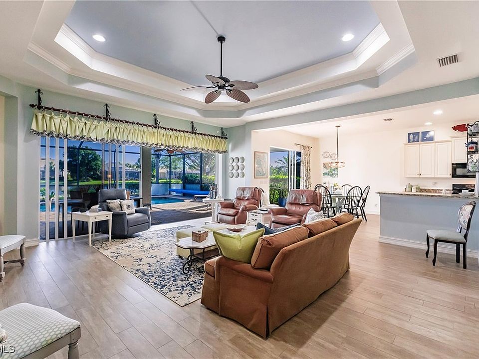 flooring, a newer A/C, new water heater, new filter assembly for the pool's salt cell, newer pool pump, solar panels, newer heat pump. Brand new washer and dryer installed 2025. The kitchen offers plenty of cabinet space, a center island, a newer refrigerator, and a picturesque view of the lake. The floor plan creates an open and inviting atmosphere, with tray ceilings and crown molding throughout the home, as well as all tile