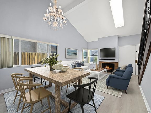 Experience the perfect blend of comfort and style in this beautiful 3 bedroom, 2 bath twinhome in Poway's desirable Flair neighborhood - designed to feel just like a detached home. Full bedroom and bathroom on the first floor offer flexible living options, while soaring ceilings and a light-filled, open floor plan create an inviting atmosphere. The living and dining areas feature a cozy fireplace and seamless access to a private backyard—ideal for entertaining, unwinding, or dining al fresco—with serene mountain views from upstairs. Upgrades include new luxury vinyl plank flooring downstairs, dual-paned windows, and a stylish kitchen with granite countertops, glass tile backsplash, pendant lighting, stainless steel appliances, and a walk-in pantry. The downstairs bathroom boasts granite countertops and a walk-in shower, while a decorative iron staircase leads to the additional bedrooms, which share a bathroom accented with white marble countertops and a tub/shower combo. An attached 2-car garage adds convenience, and the prime location puts you close to restaurants, shopping, entertainment, Lake Poway, Old Poway Park, and scenic hiking trails—all within the award-winning Poway Unified School District.