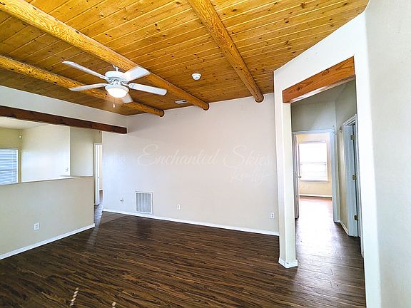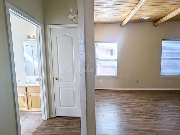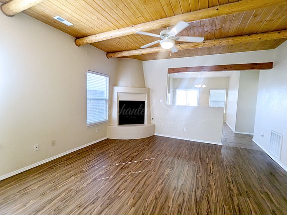 Now available for rent: This single-story pueblo-style residence is located in Rio Rancho, just minutes from Intel. Featuring three bedrooms, this home offers well-maintained living spaces and distinctive architectural details, including a 12-foot arched entry door, a kiva fireplace, laminate flooring & tile throughout for dust allergy reduction and a modern aesthetic, as well as wood vigas spanning the ceiling to enhance the traditional Southwest ambiance. Additional highlights include a wall oven and granite countertops, adding a touch of luxury. The master suite is thoughtfully separated from the secondary bedrooms and 2nd shared bathroom. The backyard is compact and easily maintained, ideal for a small garden. Tenant pays all utilities QUALIFICATIONS No Criminal No Evictions Credit Score 650+ Combined income 3x amount of rent No Pets NO Subletting NO SMOKING $40 Application Fee per Adult 18+