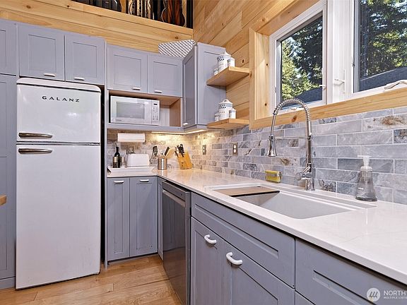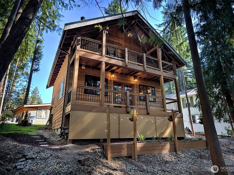 Nestled among evergreens, on Lake Leprechaun at Lake Limerick, this custom cedar chalet style home feels like a storybook. Inside, the tongue & groove knotty pine, warm lighting & wood stove create pure coziness. Filled w/natural light, the loft opens to the airy living space below connected by a walkway to a covered deck-perfect for swaying in a hammock among the treetops. The kitchen shines w/quartz counters, smart roll-out shelving, island & breakfast bar. Watch from a second deck, as deer wander through & birds sing in your Certified Wildlife Habitat backyard. Read on the private dock, kayak or work in your hobby shop. Low-maintenance gardens, ductless heat-pump & walkable crawl space, make this home is as practical as it is enchanting.