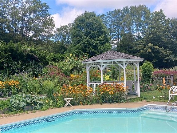 Built in 1835, overlooking Hardwick common, this historic and elegant, well preserved estate abounds with charm and impressive craftsmanship. You will find ten foot high ceilings, beautiful chandeliers, ornate woodwork, original Red pine floors, tall windows, wrap around porch an inviting in ground pool surrounded by a large fenced in perennial garden with raised beds, stone walls and a gazebo for those tranquil summer evenings. An updated functional kitchen and large formal dining room with connecting parlors make for easy entertaining. 4 bedrooms are upstairs and the first floor bedroom includes walk through closet, adjoining paneled office, private bath and entry to the pool garden. The third floor (1200 sq. ft.) could be finished with little investment. And then there are the garages.... acres of space. think car collection, stellar workshop, etc. All this in a lovely New England village setting, close to the Quabbin resovoir...(56,000 protected acres.)