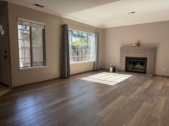 The home includes three bedrooms and two full bathrooms upstairs, one half bath downstairs. The two full bathrooms feature shower over tub combinations with sliding glass doors. The interior of the home is freshly painted and has brand new flooring, excepting the kitchen and downstairs bath which remains the original tile. The kitchen has an all new Smart (ex. fridge) appliance suite by GE, the garage houses a brand new Smart washer and dryer by Samsung with pedestal storage under both, and also has a water heater that is ~1yr old. The homes exterior boasts a 6ft brick and wood gated enclosure, with gates locking from inside and out in the front and rear. The enclosed patio oasis has a freshly installed trellis and timed drip watering system and is being landscaped as we speak! The West Sequoia Village neighborhood that the home is located in is very friendly and features locked mailboxes in the central courtyard along with new landscaping and grass where the HOA or individual homeowners occasionally host events. Come and see this newly refreshed home in a charming neighborhood! I'll be there today working on the landscaping to get it ready for the 1st! As we are still working on it, please understand there are still things to do and items to move.