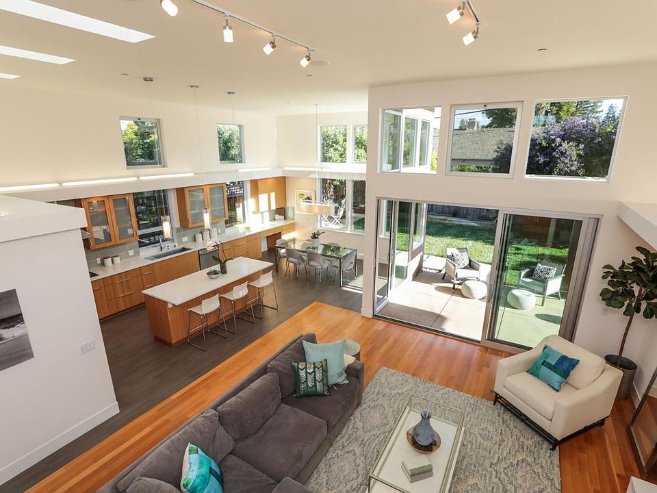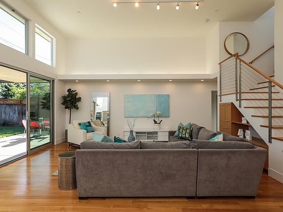 Los Altos Schools. Lots of natural light with sweeping 14-foot ceilings. The afternoon sun shines into a greatroom with kitchen, living room, and dining area. First-floor master bedroom suite with walk in closet and office that coverts to a guest room. The master bath has heated tile floors, a walk-in shower, skylight, and dual vanity. Two second first-floor bedrooms share a landing perfect for homework room or hangout area and a full bath. Located in St. Francis Acres blocks to downtown Mountain View and top rated Los Altos Schools.