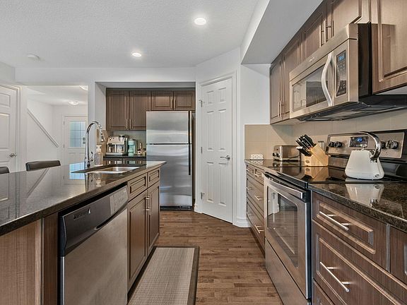 13410 166 Ave, Edmonton — Immaculate, move-in ready. Sunlit, open-concept main floor with hardwood and large windows. The showpiece kitchen features a large island with seating, granite counters, full-height cabinetry, tile backsplash and stainless steel appliances, plus a walk-through pantry from the mudroom straight into the kitchen. The dining area opens to the deck and fenced yard—ideal for BBQs. Upstairs offers a rare layout: two primary bedrooms, each with its own ensuite and walk-in, plus upper-floor laundry. Stay comfortable year-round with air conditioning. Attached garage, smart storage, and a quiet NW location close to parks, schools, shopping and commuter routes. Stylish, functional and exceptionally well cared for—this is a home you’ll be proud to own.