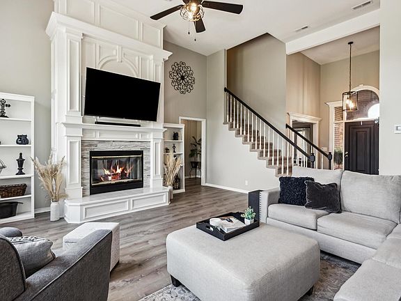 Absolutely stunning turnkey home in the beloved Rainbow Lakes Addition! Beautiful lake and pool views on a .75 acre lot make this home a must see! This impressive 5 bedroom, 3.5 bath residence boasts luxurious features designed for comfort and style. As you step inside, you are greeted by an open living space with 14-foot ceilings, large windows overlooking the amazing backyard, a two-way fireplace and upgraded luxury vinyl flooring. The well-appointed kitchen is a chef’s delight complete with Quartz countertops, large island, under-counter lighting, pantry, stainless steel appliances and attached hearth room. There is an informal eating space in the kitchen and formal dining room as well. Convenient half bath and separate main floor laundry is easily accessible from the garage. The main floor primary suite is a true retreat featuring a coffered ceiling with views of the pond, and is equipped with a large en-suite bath featuring a jetted tub, separate shower and a spacious walk-in closet. Upstairs you will find three generously sized bedrooms and another full bath. View out basement features a large rec room for entertaining, a huge bedroom with en-suite bath and lots of storage space. Outdoor living is equally impressive with a spacious deck, flagstone patio with a fire pit, mature trees, and views of the pond. Fabulous 20 X 40 salt water pool will be the focal point of all your family gatherings and entertaining! The expansive yard is fully fenced and meticulously maintained with a sprinkler system and irrigation well. The oversized three-car garage offers ample space for vehicles and storage. As an added bonus there are warranties that transfer to Buyer for the shingles and Champion windows! This property is a rare find in the Goddard school district and is free from special taxes!