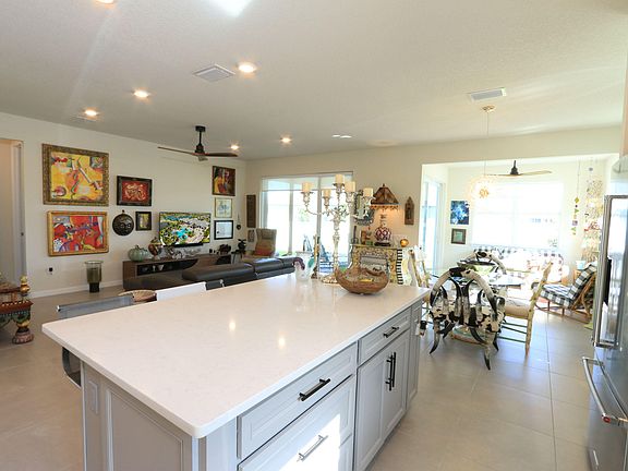 Stunning Prosperity model, where light, style, and comfort come together beautifully. This bright, open-concept floor plan features tile flooring throughout the main living areas., with rich hickory flooring in the bedrooms & versatile flex room, perfect for an office or den.The modern kitchen shines with upgraded appliances, elegant finishes, and thoughtful details that make cooking and entertaining a joy. Throughout the home, you'll find upgraded mirrors, ceiling fans, and top-of-the-line plumbing fixtures, adding both function and sophistication.Relax in the inviting sunroom or step outside to the extended lanai, ideal for enjoying the Florida lifestyle. The fenced backyard overlooks a peaceful water view, surrounded by lush landscaping. Designer finishes, meticulously detailed