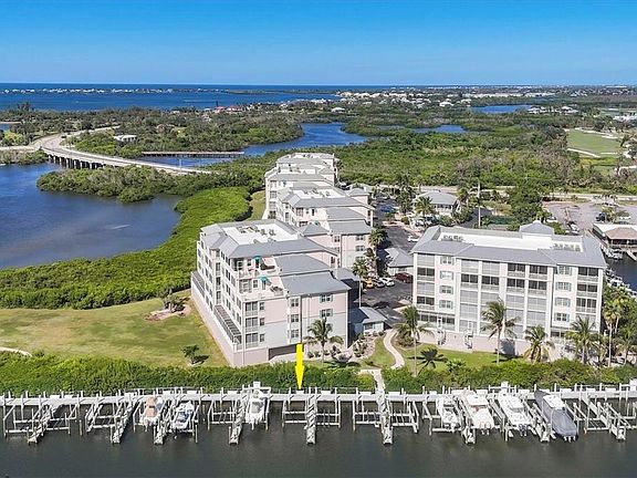 WATERFRONT FIFTH FLOOR PENTHOUSE WITH 3 BEDROOMS AND 3 FULL BATHS PLUS A DEEDED BOAT SLIP WITH 12,000 Lb LIFT AND 2 CAR GARAGE! With over 2100sq ft under air, this condo includes a large totally renovated kitchen and an open dining and living area, all with water views. You cannot beat the large waterfront screened porch and open porch with plenty of room for sunning and grilling, a rarity in a condo. Beautiful ceramic tile floors have been added throughout this one level condo in all the main living areas. All hurricane impact resistant windows and doors as well as hurricane shutters on the screened lanai. The master bedroom has water views, his and hers walk in closets and an ensuite master bathroom. There are 2 guest bedrooms, one with an ensuite bathroom. The third full bathroom serves one of the guest bedrooms and is also utilized as a guest bath. 40FT DEEDED ON SITE BOAT SLIP WITH 12,000 LB LIFT AND 4 NEW PILINGS INCLUDED. Boca Vista Harbor amenities include a gated entrance, heated pool and spa, tennis or pickleball court and kayak and paddle board launch area. Across the street is the entrance to the Pioneer Trail with 7 miles for walking, jogging or biking. Located 5 minutes from the State Park beaches of Boca Grande and adjacent to a full service marina with fuel, service, supplies and restaurant. Numerous Golf Courses are close by, both private and public. Call now for your private showing.