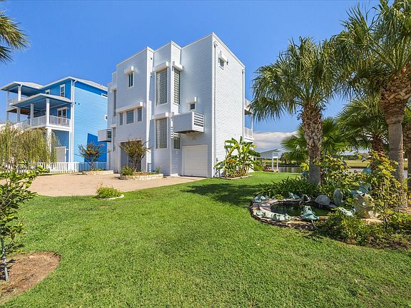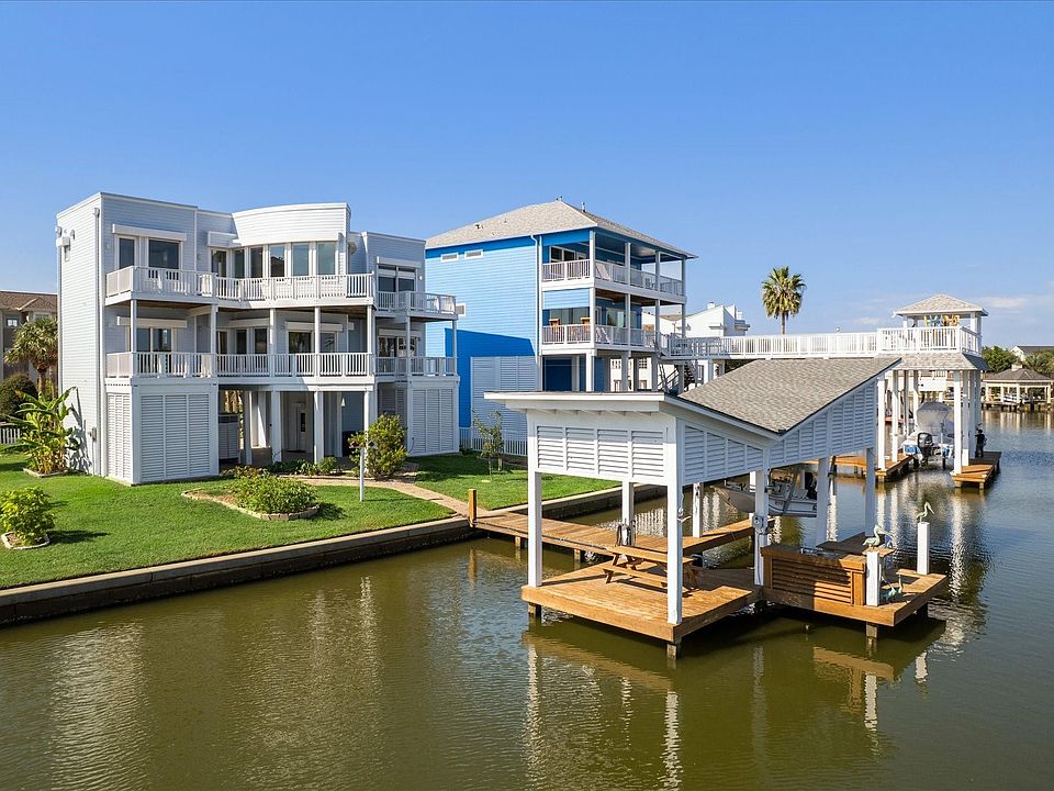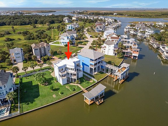 Designed by famed architect David Mullican. Beautiful updated CANAL front home in coveted Laffite's Cove. 4 bedrooms/4 baths. NEW Hardiplank exterior for easy care (2025), new roof (2025). Interior taken to studs and remodeled 2025 - updates include: New lighting; new floors; new deck and railings; new paint inside and out. Elevator to all levels. Pavered extra large driveway. Electric exterior aluminum storm shutters all around. Laffite's Cove is a no STR neighborhood. No 4 year wait to get into the Galveston Country Club. A coveted social membership to Galveston Country Club transfers with property. All info per Seller.