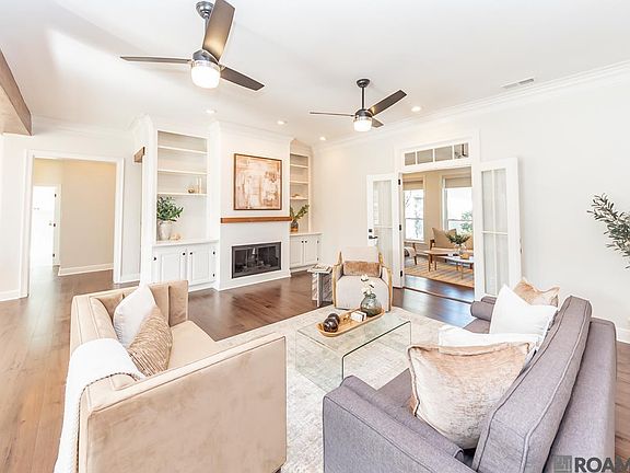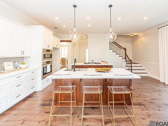 Set along Baton Rouge’s well-known Highland Road, this home offers the best of both presence and comfort. Sitting on a .7-acre corner lot, it enjoys a sense of space and neighborhood connection that’s hard to find. The curb appeal makes a strong first impression, but once inside, the home immediately feels inviting. Iron-framed glass doors bring in natural light while adding security, and wood floors throughout the main level create a warm, cohesive feel. The open living and dining area features dark-stained beams, high end light fixtures, custom built-ins, and a gas fireplace—an easy place to gather or unwind. Just off the living room is a study with automatic shades and a full wall of bookshelves, perfect for a home office, playroom, or quiet retreat. The kitchen is designed for everyday life and entertaining alike, with dual islands, quartz countertops, Bosch appliances, ample storage, and views of the neighborhood lake and evening sunsets. The first floor includes 2 bedrooms and 2.5 baths, with the primary suite being filled with natural light, offering dual walk-in closets and a well-appointed bath with a soaking tub, dual vanities, and separate shower. Upstairs are two additional bedrooms, two full baths, with a bonus room and generously sized closets throughout. Outside, the backyard is calm and shaded by a beautiful oak tree, featuring an outdoor kitchen, extended patio, and full fencing—ideal for slow mornings and relaxed evenings. Conveniently located on the St. George bus route and just minutes from St. Jude and CCL, this home is one that truly fits the way people live.
