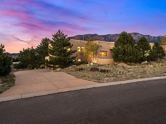 Enjoy the best of the High Desert lifestyle from this exceptional custom home, perfectly positioned to capture stunning views of the Sandia Mountains and the city lights. Step outside your front door to an extensive network of trails ideal for hiking, and walking. This classic Southwest residence showcases exquisite craftsmanship throughout, including furniture-grade cabinetry, custom wood doors, hand-troweled plaster walls, a stained-glass entry surround, reclaimed hardwood floors, and beautiful beamed ceilings. Each bedroom features its own en-suite bath and walk-in closet, offering comfort and privacy. Designed for outdoor living, the home features two tranquil water features, an outdoor kitchen, a cozy fire pit, and a spacious covered portal perfect for enjoying the breathtaking views