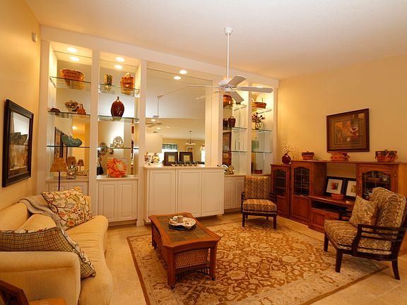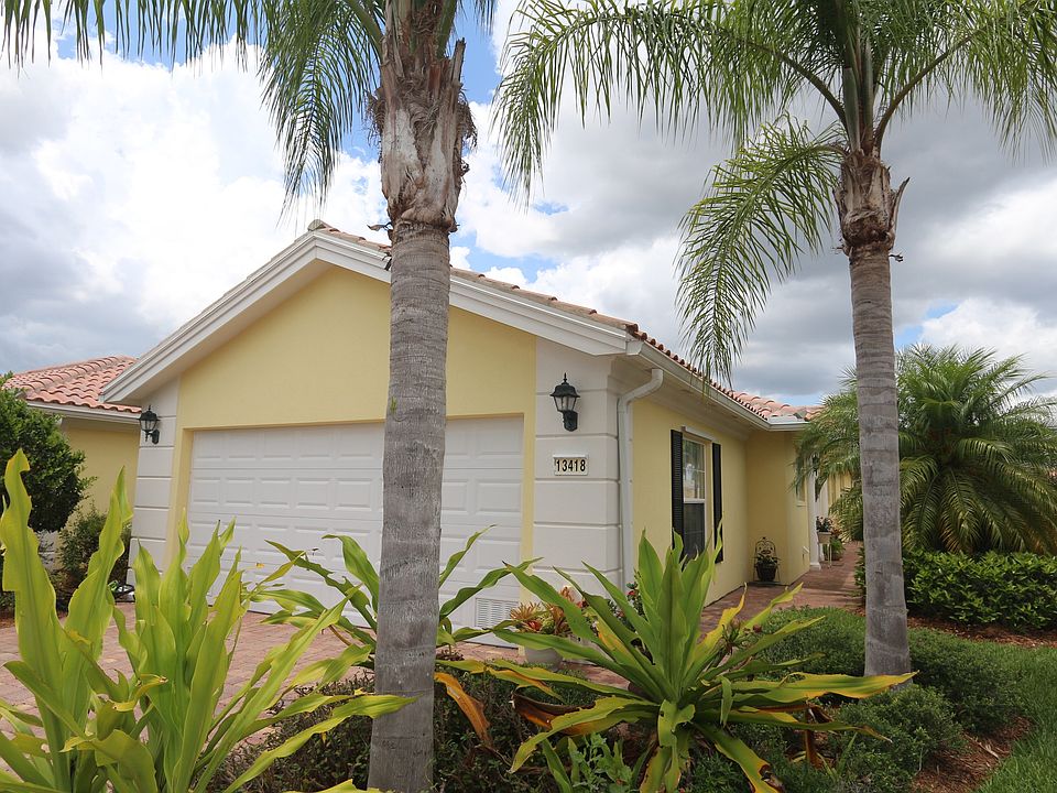 Impeccably clean and wonderful water view from this executive villa which is maintenance free living. Living room, family room, large laundry room & pantry with 2 bedrooms and 2 baths. Large screened patio overlooking pond and walk to clubhouse with social director and many activities. Whole house vacuum, non skid painted garage floor, wonderful tile floors and a truly delightful home. Guard gate, 2 swimming pools, tennis, baccy ball, fitness center, dining room, library, zumba + dance center, basketball and more. You will not find anything this nice with these amenities. Excellent credit required. This is a 7 month lease and then will have a rent increase to $1300.