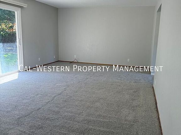 The living room boasts new plush carpet, fresh paint, a decorative fireplace, and dual-pane sliders opening to the spacious backyard.