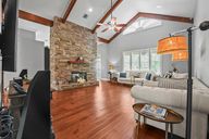 Center islandFunctional eleganceDramatic beamed ceilingsOversized three-car garageSpacious floor planUnique two-sided stone fireplaceArchitectural elegance