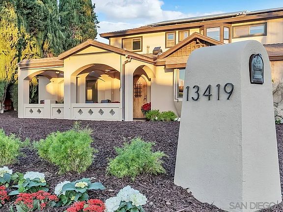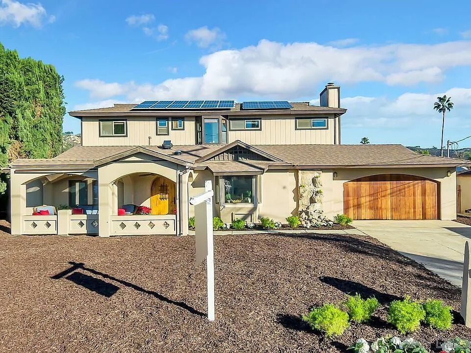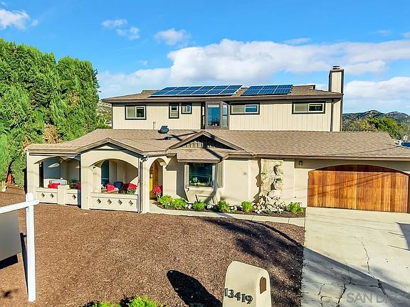 Welcome to this spacious home in the charming city of Poway, known as the "city in the country". As you step inside, you'll be greeted by a large kitchen boasting a Viking double oven/stove, full-size refrigerator, and freezer, perfect for the culinary enthusiast. The home features two cozy fireplaces, a whole house fan, water filtration system, and owned solar panels, ensuring comfort and energy efficiency year-round. The expansive family room offers ample space for relaxation and entertainment, while two bedrooms and 1.5 bathrooms downstairs provide convenience and versatility. Upstairs, the beautiful primary suite awaits, complete with a fireplace and an adjoining room suitable for an office, nursery, or additional bedroom. A bonus room currently utilized as a billiards room presents the exciting potential to be transformed into an ADU, offering a separate living space for in-laws or creating a lucrative rental opportunity. The welcoming front porch is perfect for enjoying stunning sunsets and fostering a sense of community, in a friendly neighborhood. There are 3 backyard sheds for storage and/or workshops and a grilling area. The home is conveniently located near an array of amenities including restaurants, parks, and scenic trails, catering to an active and vibrant lifestyle. With no HOA or Mello-Roos, and part of the esteemed Unified Poway School District, this residence offers both convenience and quality education.